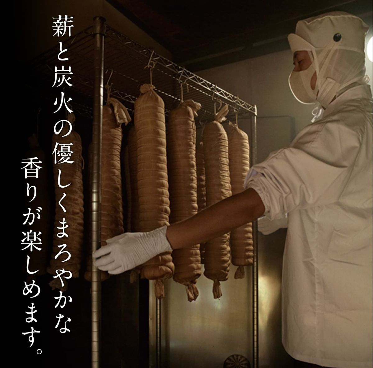 1カ月にわたり、長期氷温漬け込みによる肉と脂肪の熟成したとろける旨味は、通常のハムでは決して味わうことのできない美味しさ。一本一本綿布を手で巻き、薪と炭火でじっくりと仕上げます。時間・手間をかけて造られた製品は他では真似のできない、やわらかな燻煙の香りとなり、肉本来の旨味と、とろけるような食感に仕上がるのです。