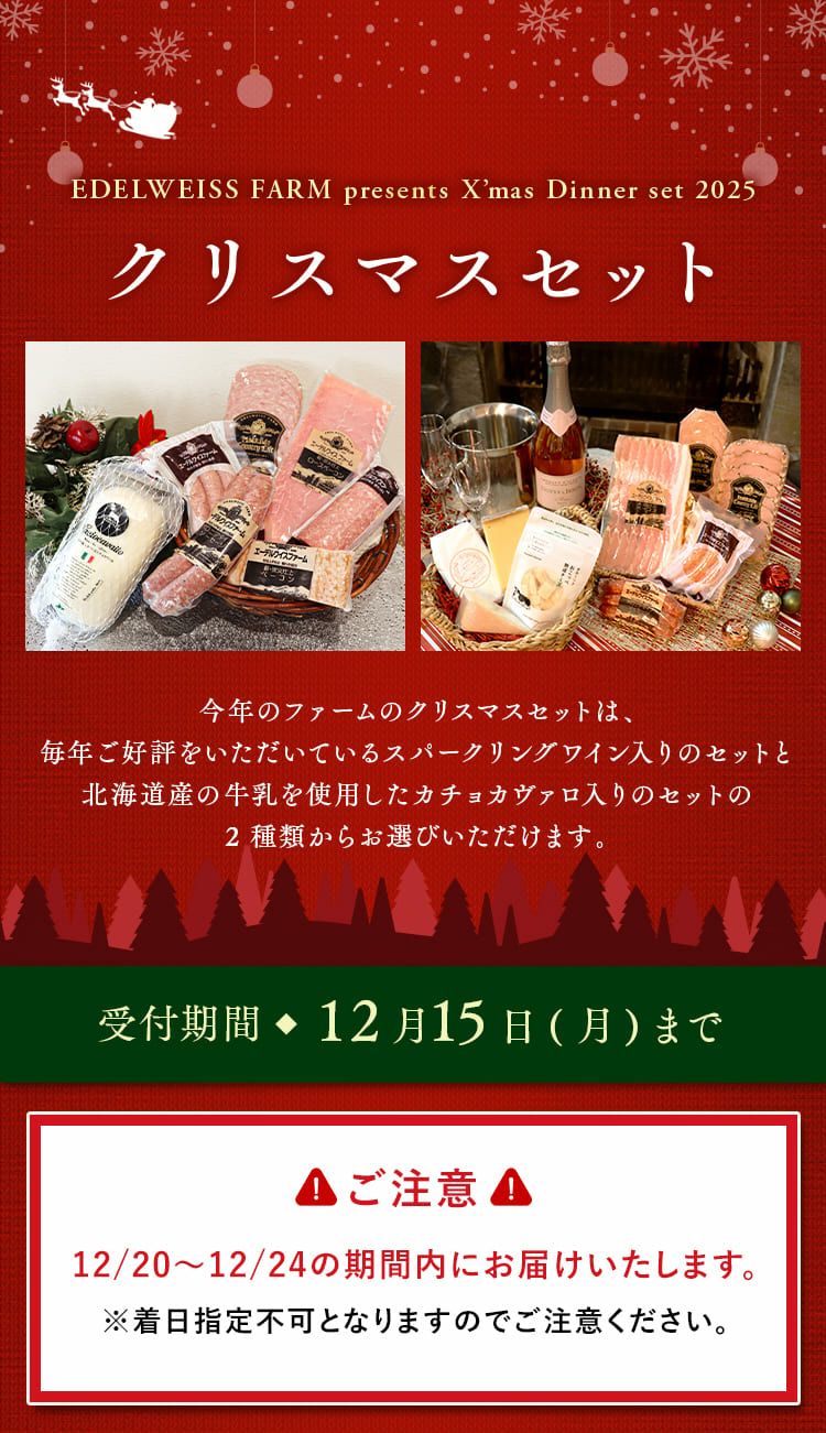 他の画像を見る EDELWEISS FARM presents X’mas Dinner set 2025 クリスマスセットA FATTORIABIOHOKKAIDO カチョカヴァロセット のし不可 サービス品 対象外 専用箱 サービスデー 対象外 予約商品 こちらは予約商品です 予約販売価格 ¥ 10,800 税込 予約受付期間 2025/10/31 0:00 〜 2025/12/15 23:59 予約在庫切れ 詳細を見る お気に入りに登録する