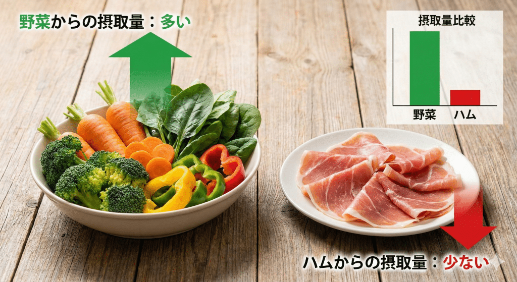 実は、私たちはハムを食べなくても、日常的に大量の亜硝酸塩を摂取しています。それは「野菜」からです。